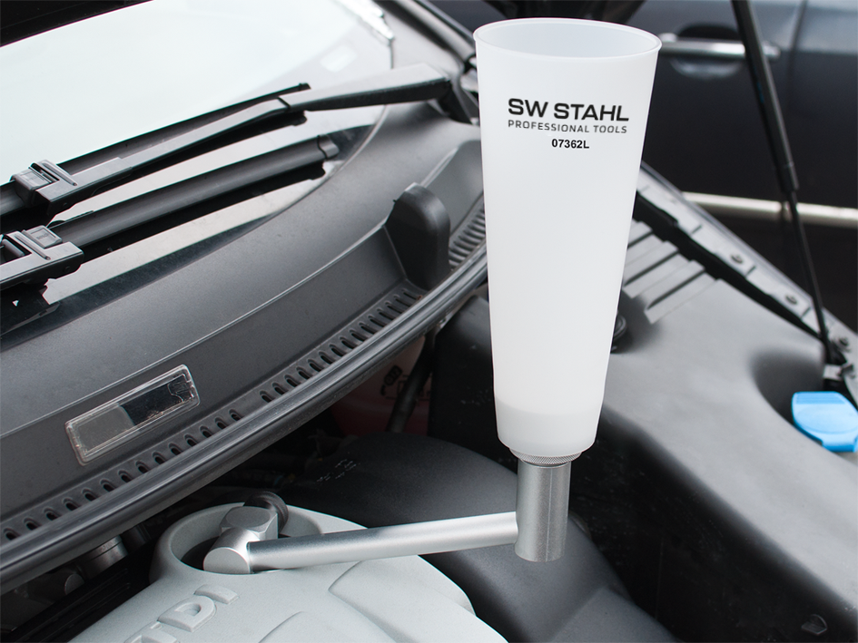 zum sauberen Einfüllen von Motoröl mit passendem Adapteraufsatz und Dichtung. Durch die dichte Verbindung mit der Einfüllöffnung wird kein Öl mehr ungewollt über Auspuffkrümmer oder Motorblock verschüttet. Die zusätzliche Winkelverlängerung ermöglicht das Einfüllen auch an schlecht erreichbaren Stellen, z.B. bei VW Sharan, Ford Galaxy, Seat Alhambra. Zeitsparend, da der Monteur während des Einfüllvorgangs andere Arbeiten verrichten kann.